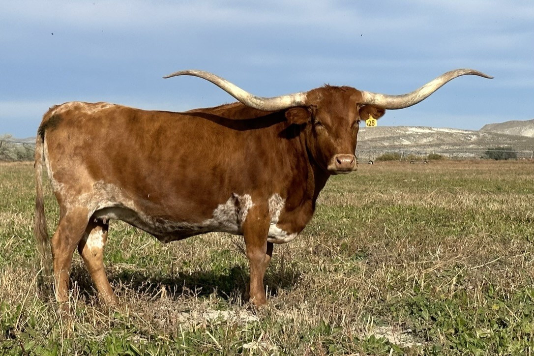 This lovely cow carries 83" of the most beautiful rolling horn and is confirmed bred to BR Jungle Jim for March 2026! Her Kid Rock heifer calf at side makes this an incredible 3-in-one package!