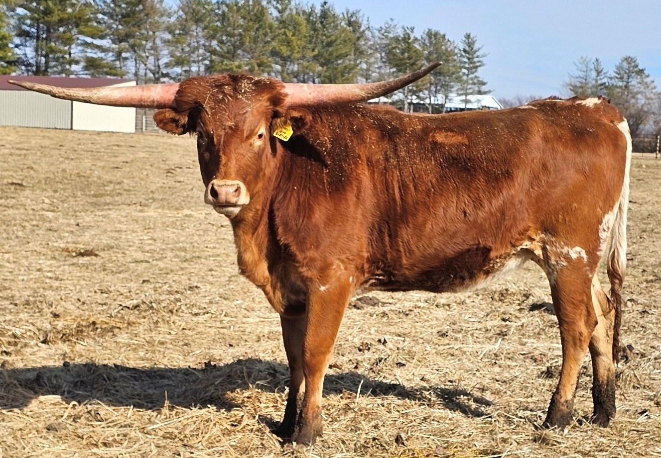 Due to Calve in Sept. 2024 Sept 23-2024 had a Heifer Calf by N8ive Legend. White with brown on head and body. Brown legs. She is in with Iron Rifle now (9-9-24) but need to get him out by Oct 15- 2024. Put back in with JH Rural Blackout on 10-15-24 or sooner.