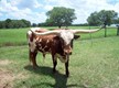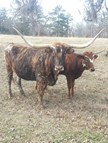Brindle with white specs on face. Nice disposition; takes cubes from hand. Charming young steer, in process of being halter-broken.